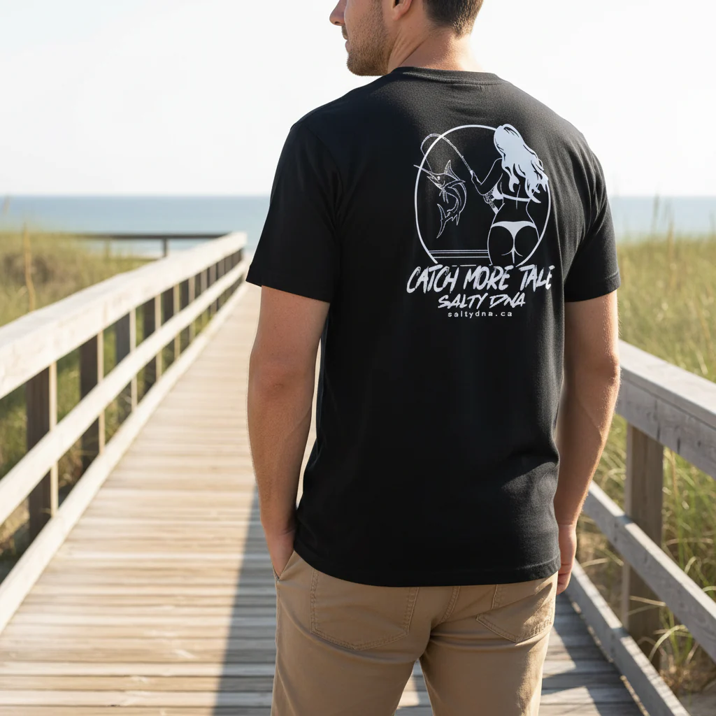 The Catch More Tale Tee features a unisex design with a distinctive women’s print on the back, available in both black and grey. Crafted for durability and comfort, this tee suits all-day wear while offering a sleek and versatile look that effortlessly fits any wardrobe.